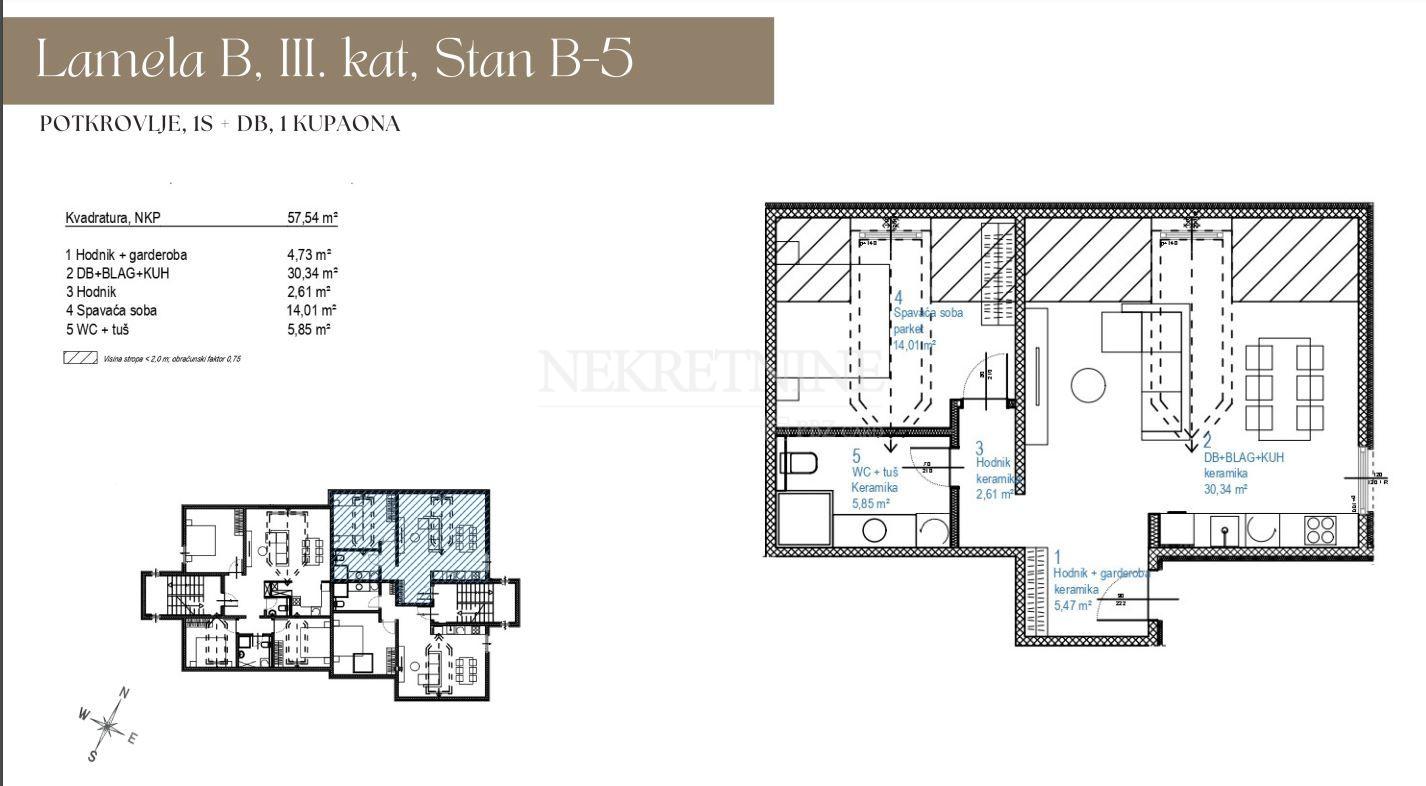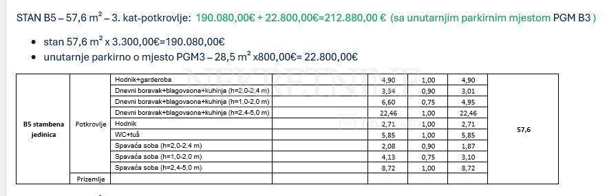 STAN B5 – 57,6 m² – 3. kat-potkrovlje:  213.120,00€ + 31.320,00€=244.440,00 €  (sa unutarnjim parkirnim mjestom PGM B3 )