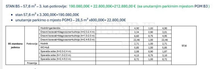 STAN B5 – 57,6 m² – 3. kat-potkrovlje: 213.120,00€ + 31.320,00€=244.440,00 € (sa unutarnjim parkirnim mjestom PGM B3 )