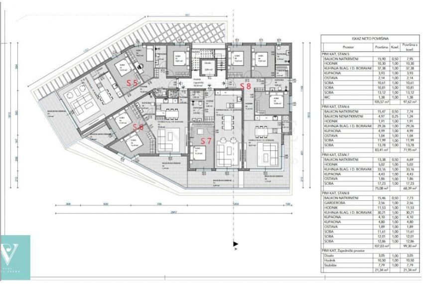 Stan se nalazi na 1.katu objekta,oznake S5, ukupne površine (sa spremištem) 97,43 m2