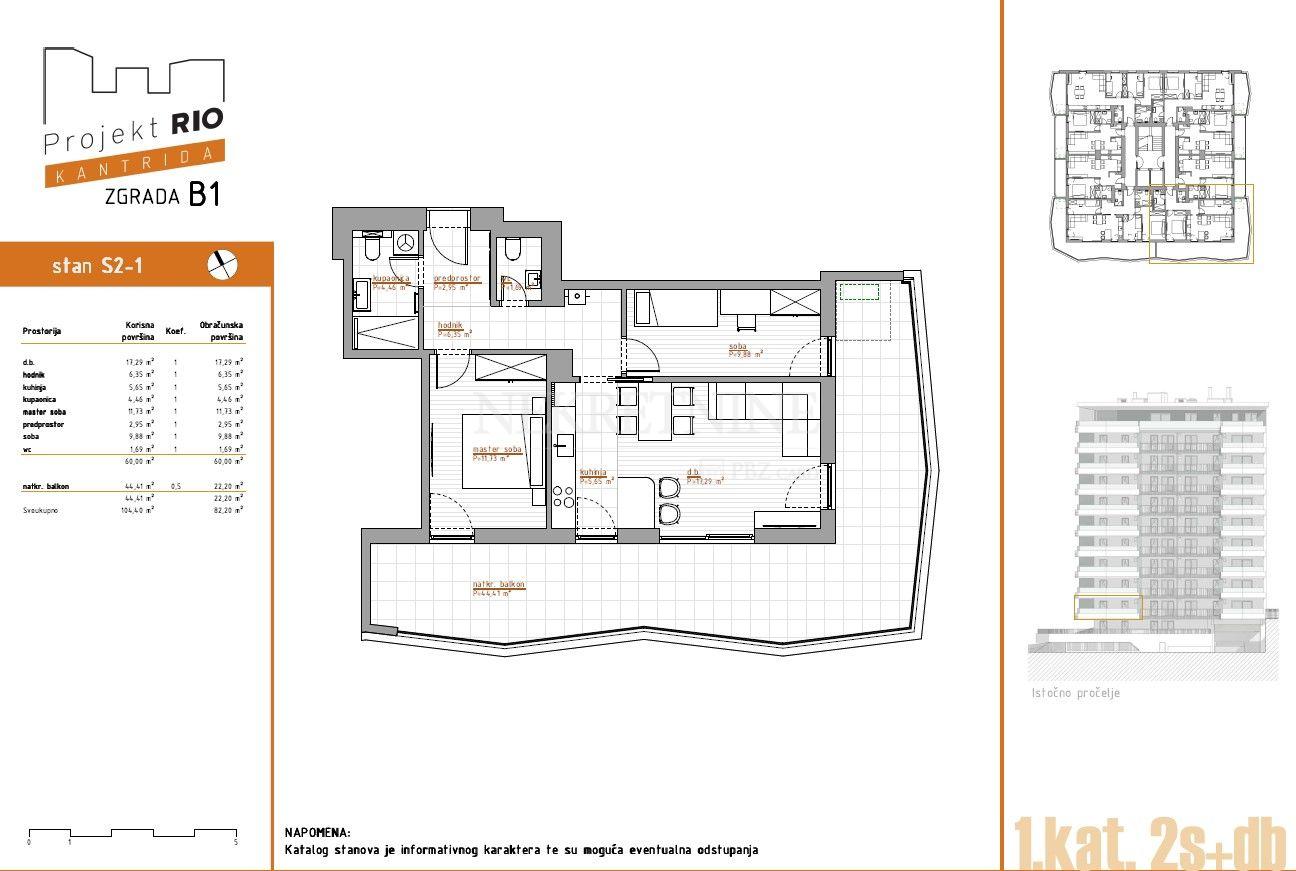 • Stan oznake S2-1-B1 ukupne netto površine 82,20 m² u objektu B1 - prvi kat, a sastoji se od predprostora, hodnika, dnevnog boravka i kuhinje, 2 spavaće sobe, kupaonice, wc-a i balkona.
